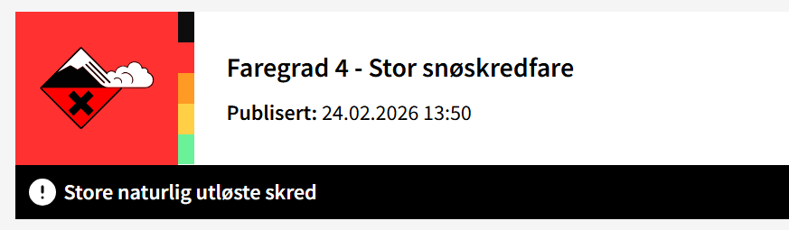 Det er venta svært farlege forhold, og det er stor sannsyn for naturleg utløyste skred. Folk blir oppmoda om å unngå skredterreng og utsette område i perioden.