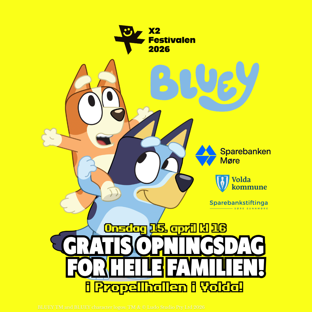 Her blir det show med Bluey & Bingo, masse leik, mat og overraskingar i og rundt Propellhallen i Volda sentrum.