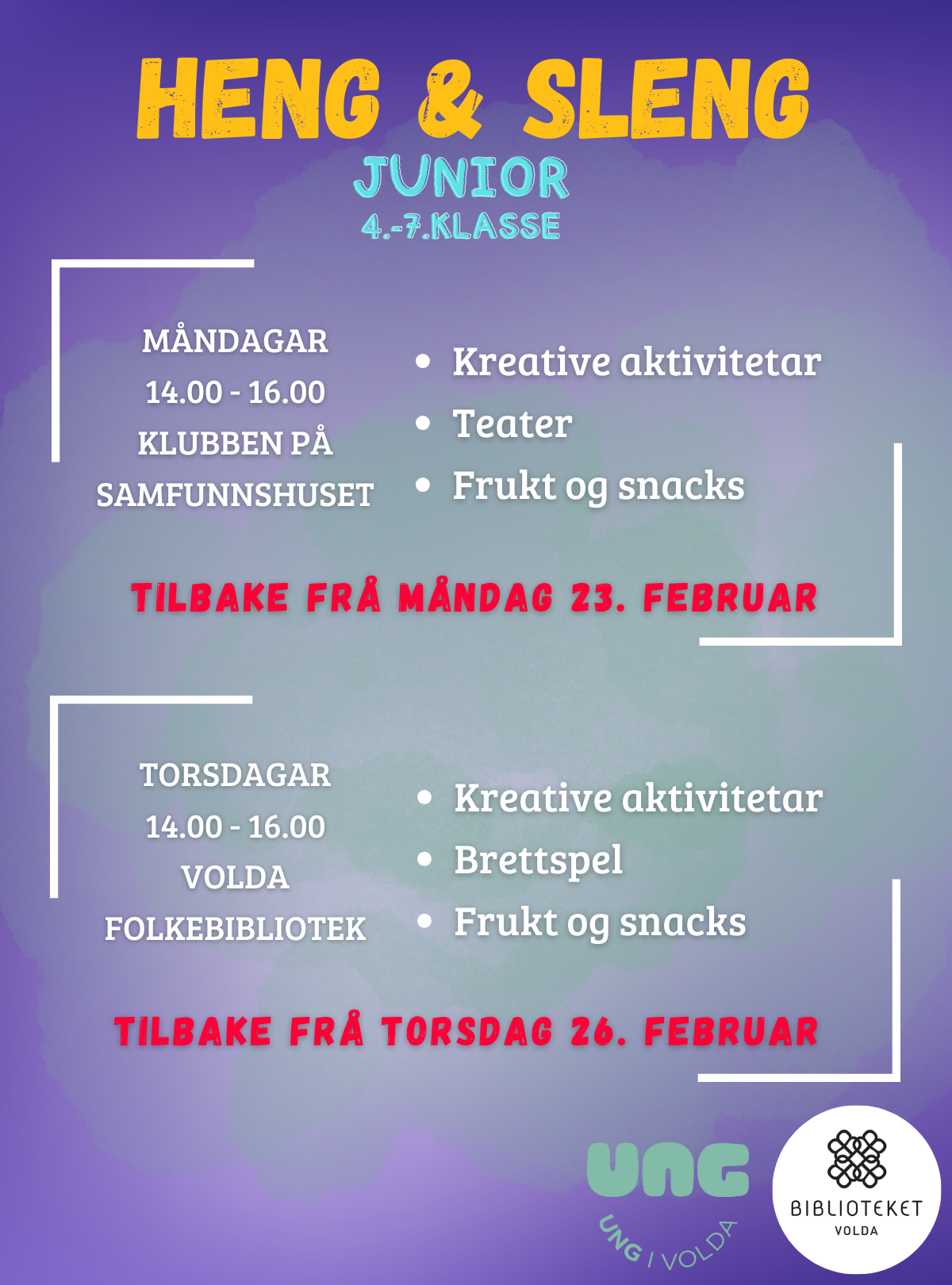 Heng & Sleng Junior startar opp att på Samfunnshuset og Volda folkebibliotek i veke 3.