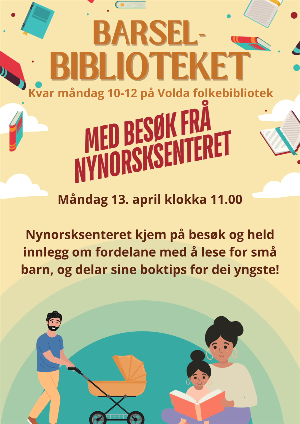 Måndag 13. april klokka 11.00 får vi besøk frå Nynorsksenteret som held innlegg om fordelane med å lese for små barn, og delar sine boktips for dei yngste.