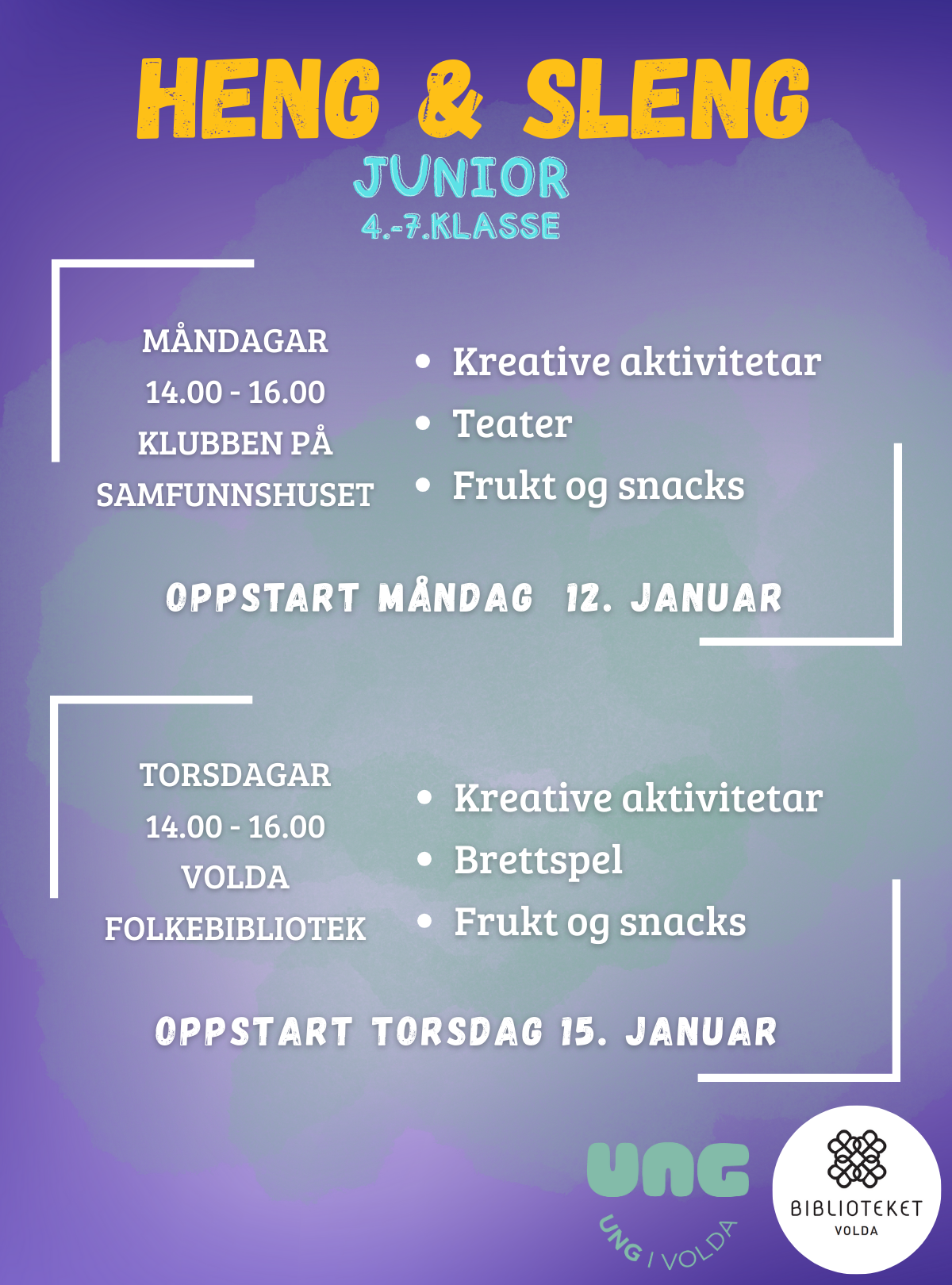 Volda folkebibliotek og Ung i Volda samarbeider om Heng & Sleng Junior, eit tilbod for born og unge i 4. - 7. klasse.