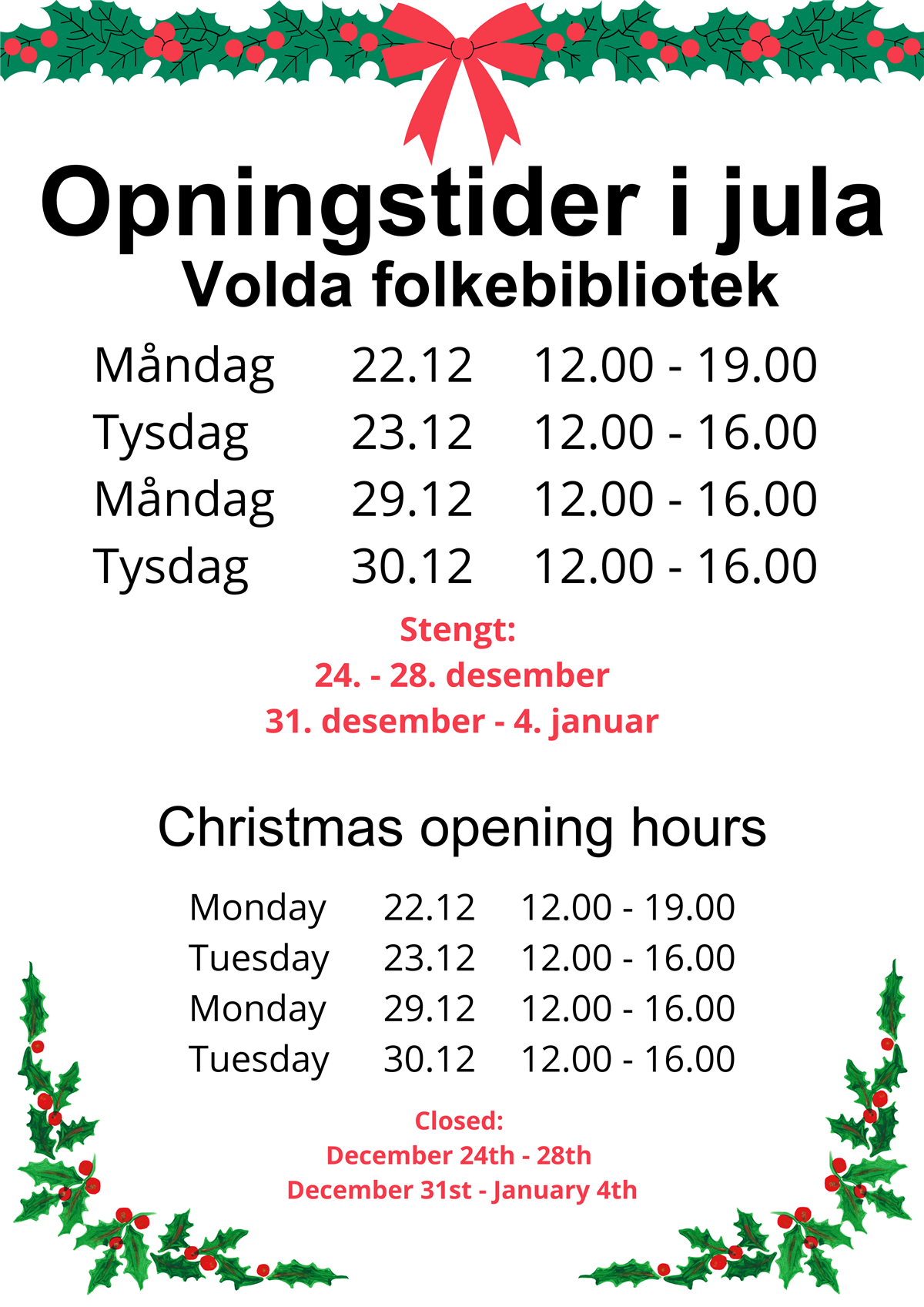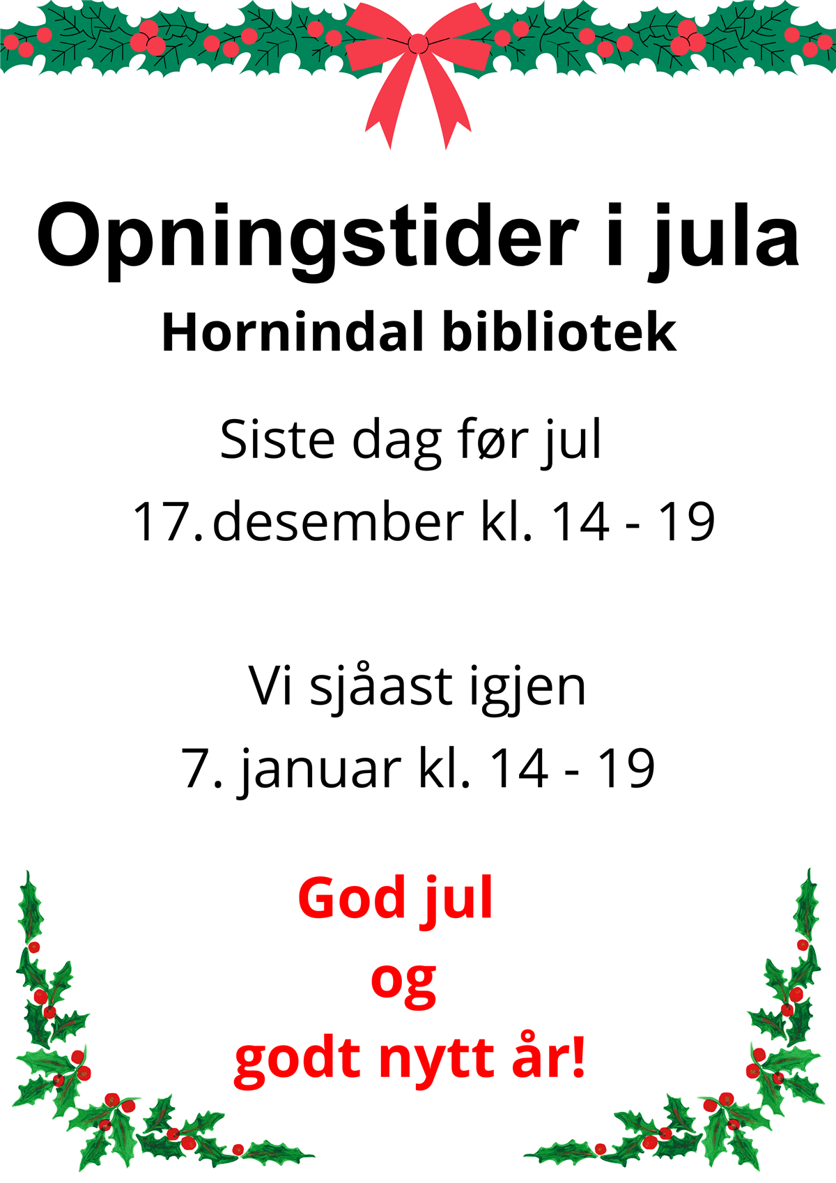 Hornindal bibliotek har siste dag ope før jul onsdag 17. desember, og held stengt i jula. Ope igjen frå onsdag 7. januar.