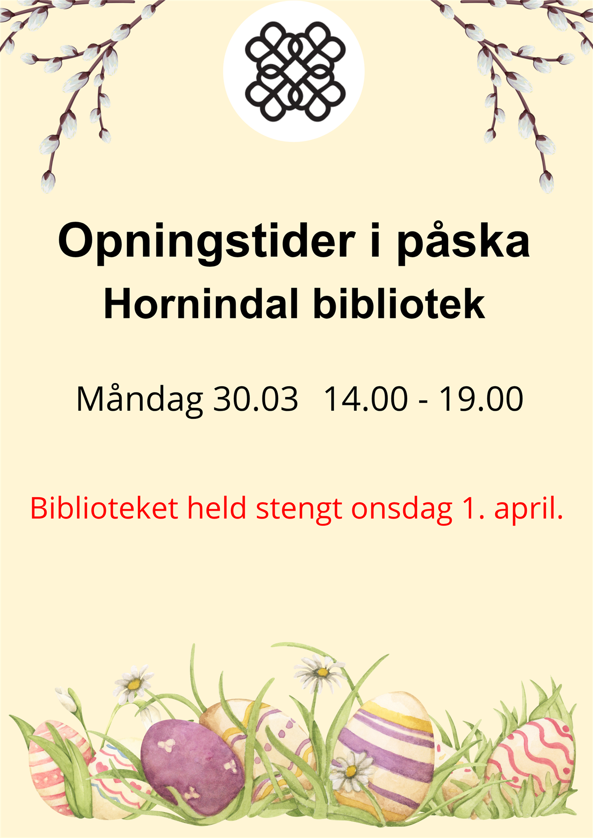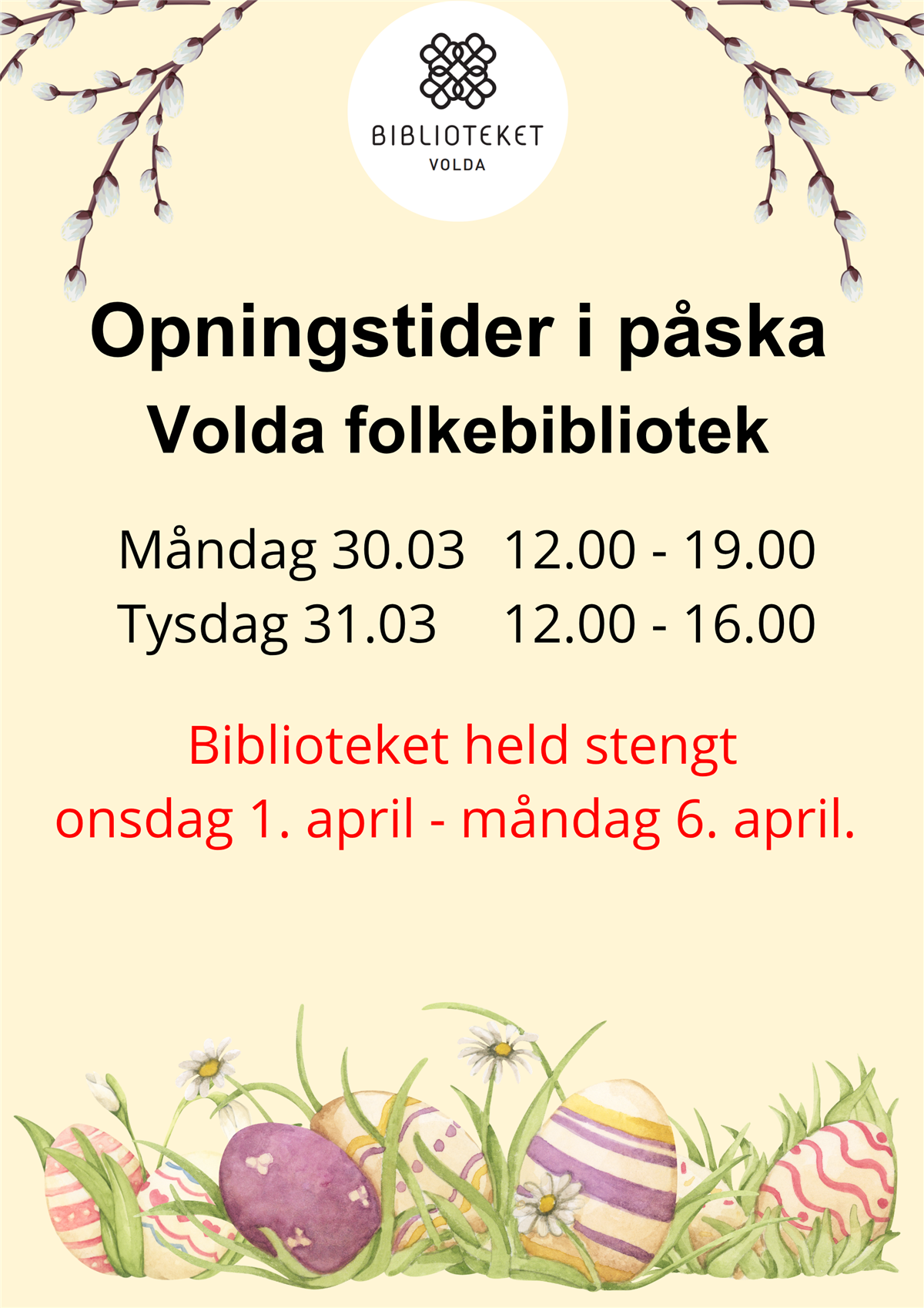 Stengt bibliotek onsdag 1. april - måndag 6. april. Vanlege opningstider frå tysdag 7. april.
