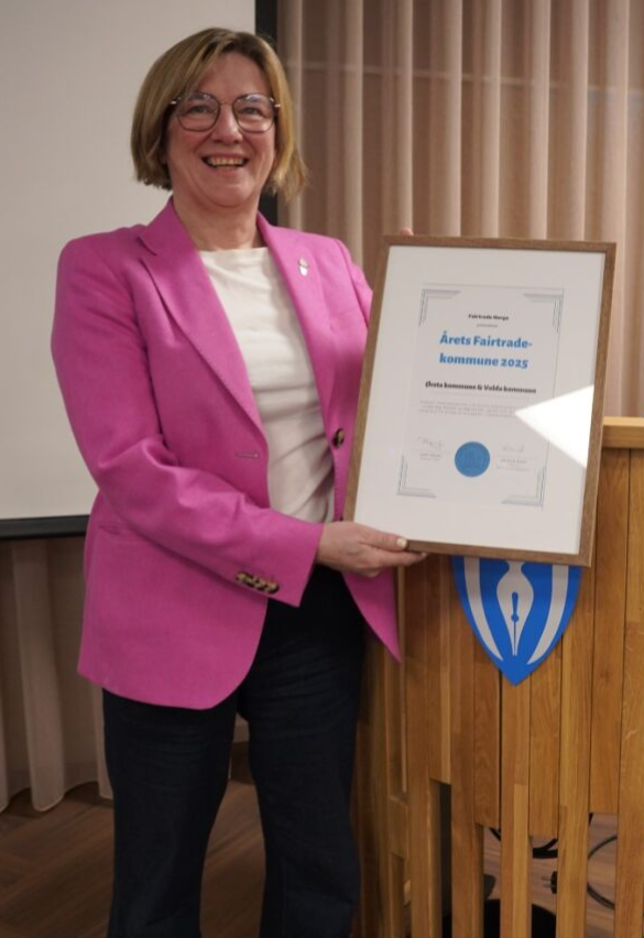 Ordførar Sølvi Dimmen viser stolt fram Diplomet for årets Fairtrade Kommune