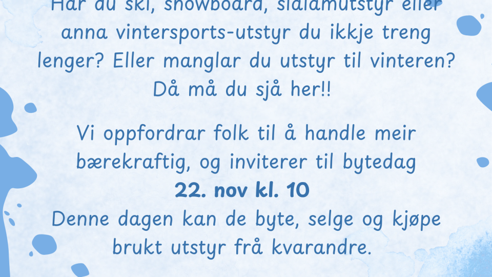Bytedag for vintersportsutstyr Har du ski, snowboard, slalåmutstyr eller anna vintersports-utstyr du ikkje treng lenger? Eller manglar du utstyr til vinteren?Då må du sjå her!!