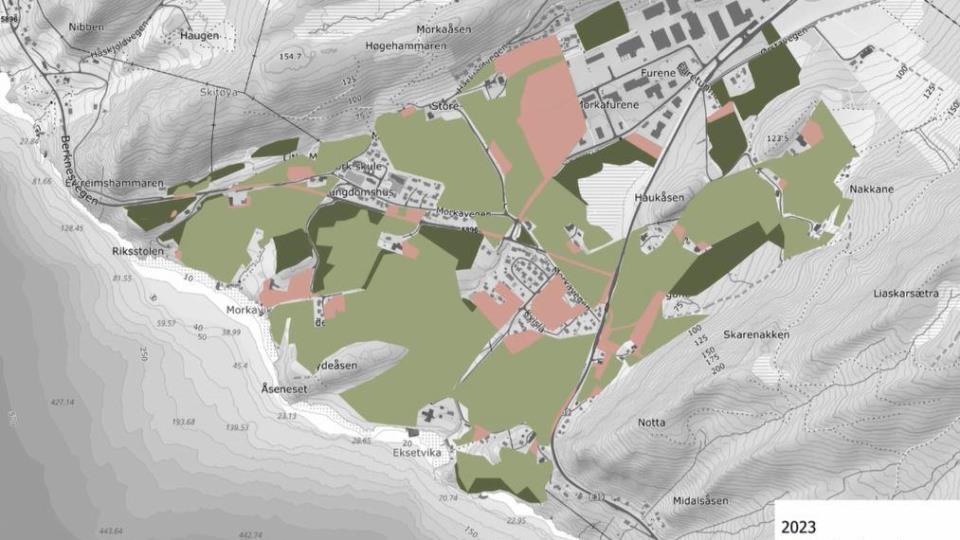 Nedbygging og nydyrking av jordbruksareal i og rundt tettstadene våre Figurane under viser korleis jordbruksarealet i og rundt tettstadene i Volda kommune har endra seg frå 1961 til 2023. På karta er lysegrøne område jor...