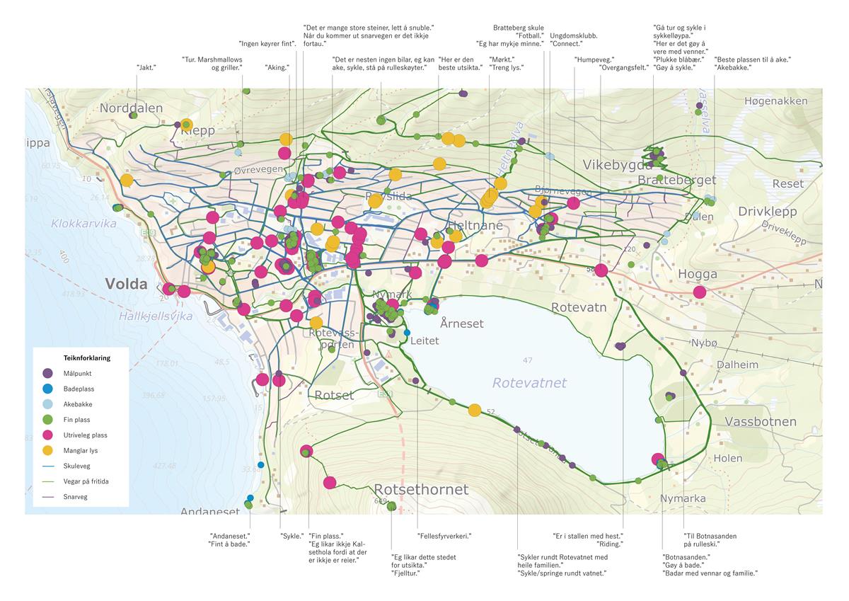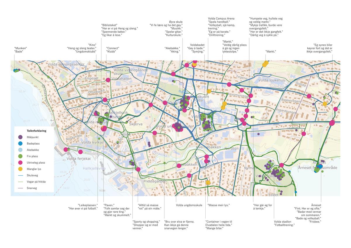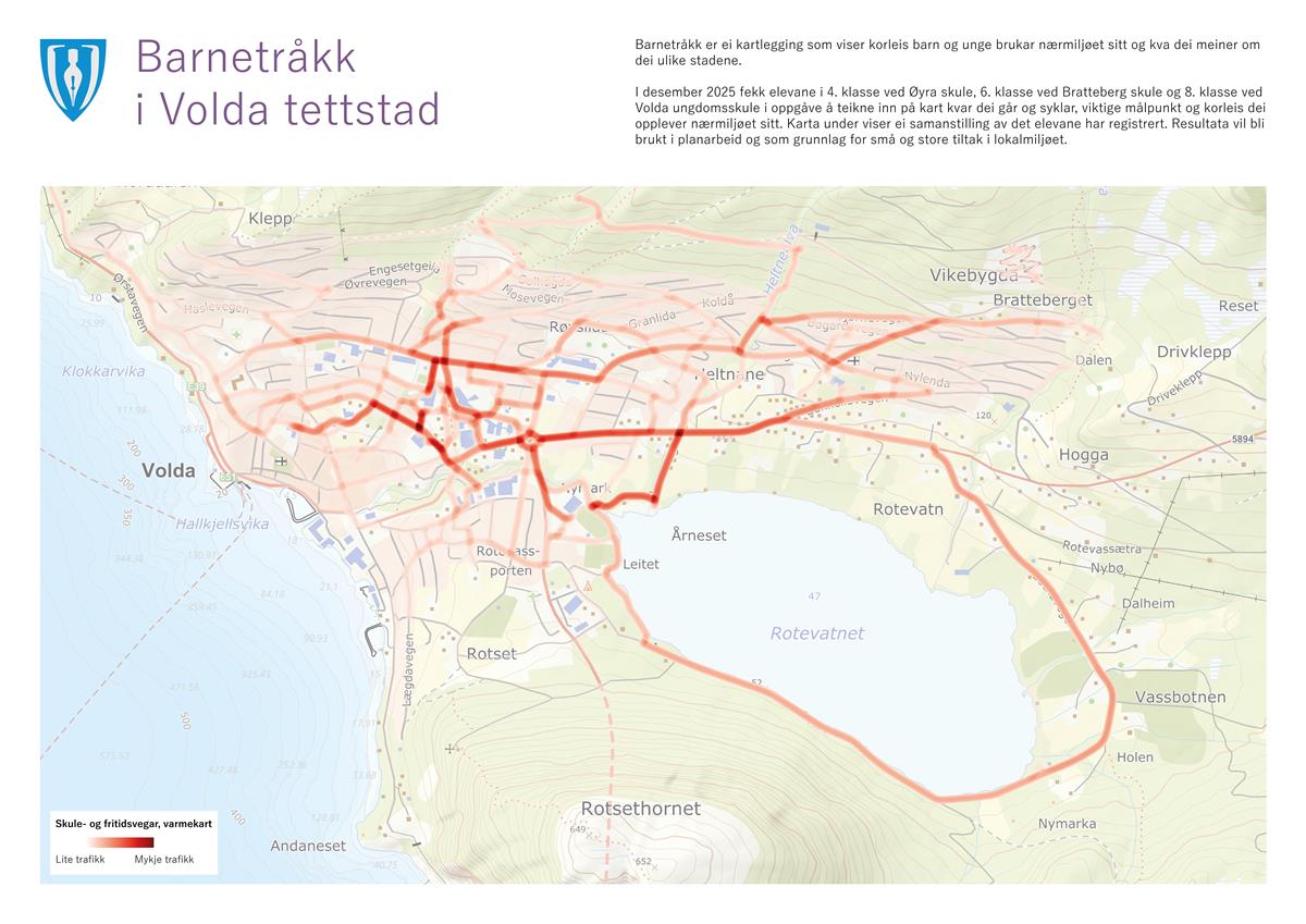 I desember 2025 fekk elevar i 4. klasse ved Øyra skule, 6. klasse ved Bratteberg skule og 8. klasse ved Volda ungdomsskule i oppgåve å teikne inn på kart kvar dei går og syklar. Dei markerte også viktige målpunkt - som skule, fritidsaktivitetar og møteplassar - og noterte korleis dei opplever nærmiljøet sitt.
