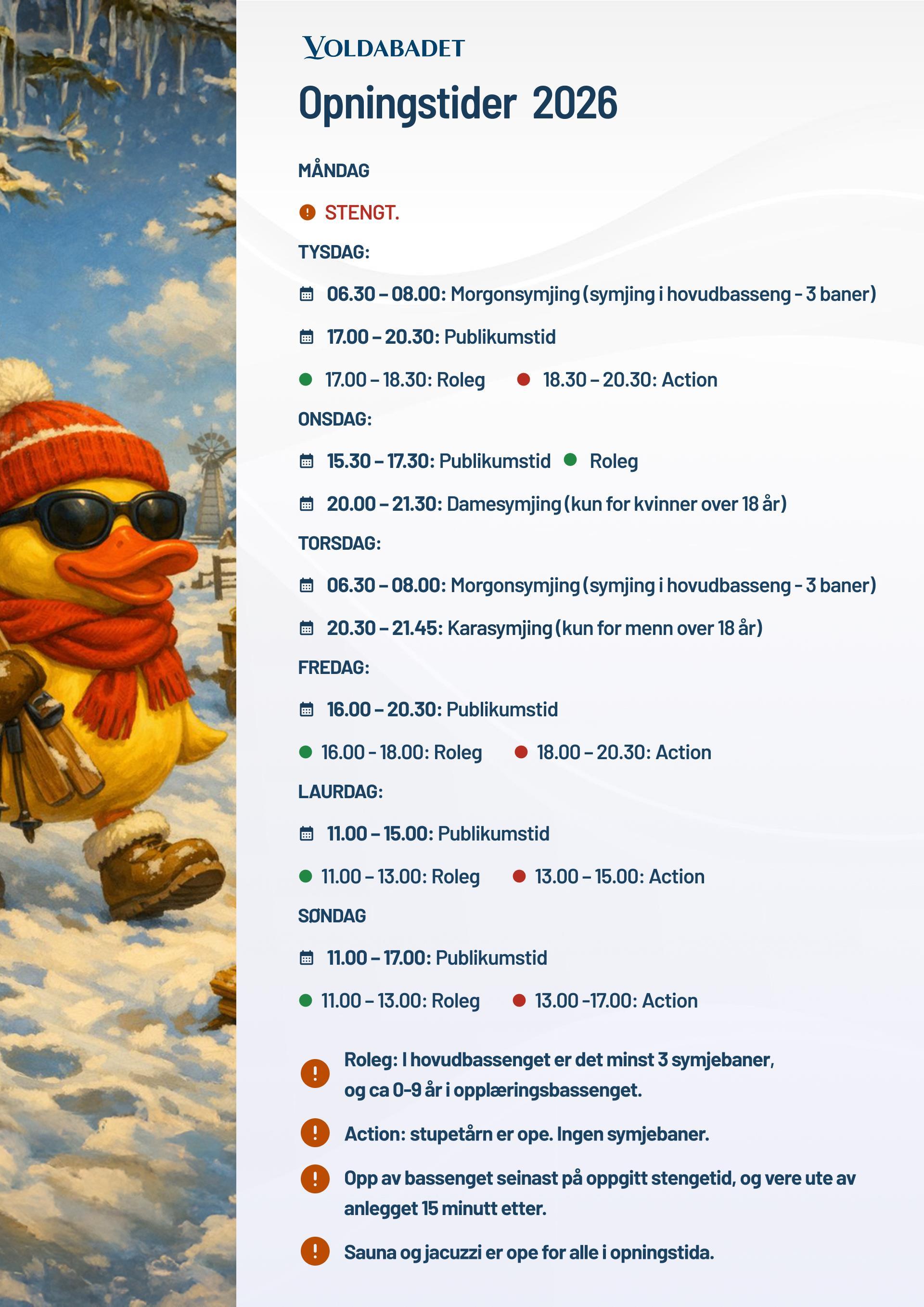 Opp av bassenget seinast på oppgitt stengetid, og vere ute av anlegget 15 minutt etter.